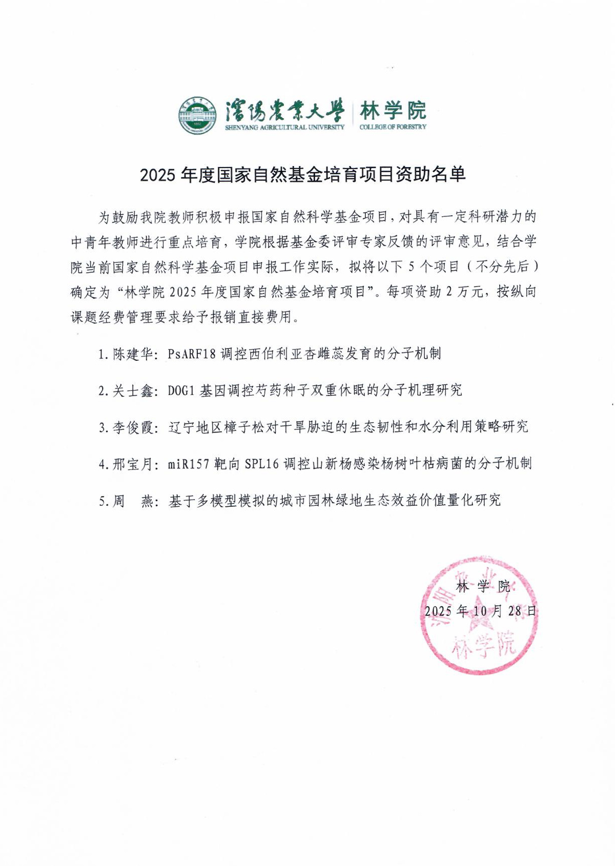 林学院2025年度国家自然基金培育项目资助名单